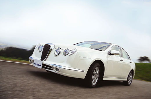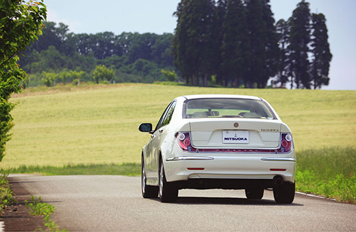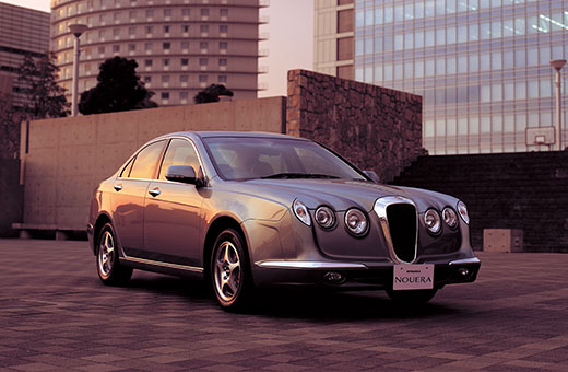 「NOUERA」(ヌエラ)は、当時の主流とは異なるデザインを目指し、ミツオカらしいクラシックデザインを活かした現代風でありながら、他とは異なるオリジナルセダンとしてオロチの息づきを感じさせます。ウインカーをフェンダーの一部とし、高いフェンダーラインからバンパー、グリルへと続くフロントデザインが、「NOUERA」の表情を創ります。