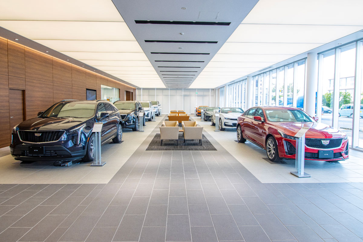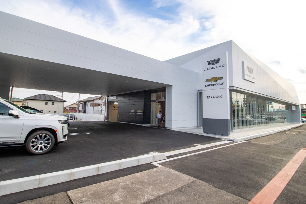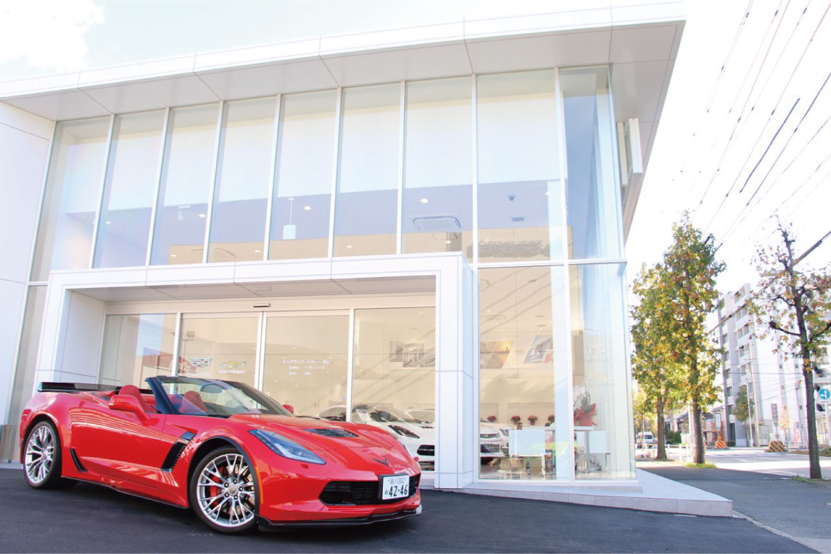 グローバルキャデラックの新CIを国内で初めて導入した新店舗を隣接地に移転しリニューアルオープン。店舗面積を旧店舗の3倍に拡充し、4ベイリフト+検査ラインを完備するサービス工場も新設。