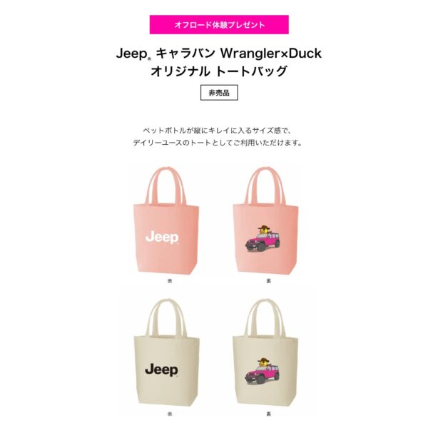 オフロード体験された方へJeep® キャラバン Wrangler Duckオリジナルトートバッグをプレゼント致します。