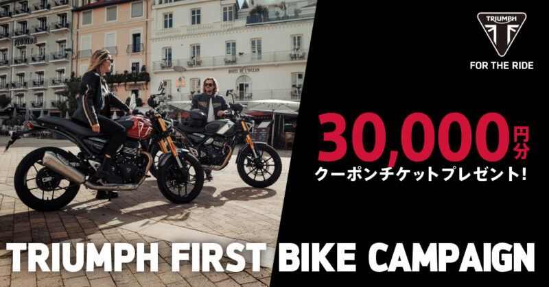 初めてのバイクライフをトライアンフでスタートさせたいという皆様にビッグニュース!いま、普通自動二輪免許取得から6ヶ月以内でアンケートへお答えいただいた方を対象に、30,000円分のクーポンチケットを進呈。対象モデルを新車でご購入の際に全国のトライアンフ正規販売店にてご利用いただけます。この絶好のチャンスをお見逃しなく。