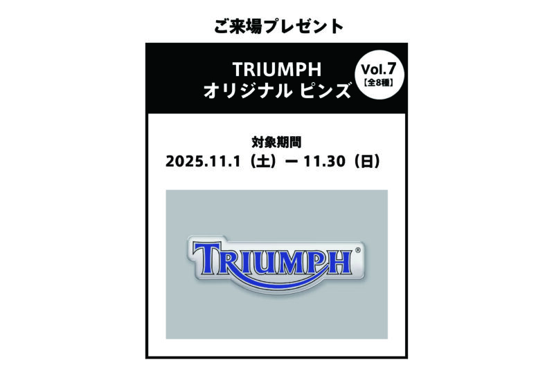 フェア期間中、全国のTRIUMPH正規販売店にご来場いただいた方に「TRIUMPHオリジナルピンバッジ Vol.7」をプレゼント。