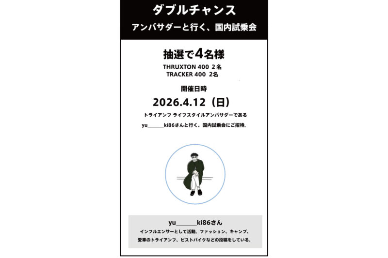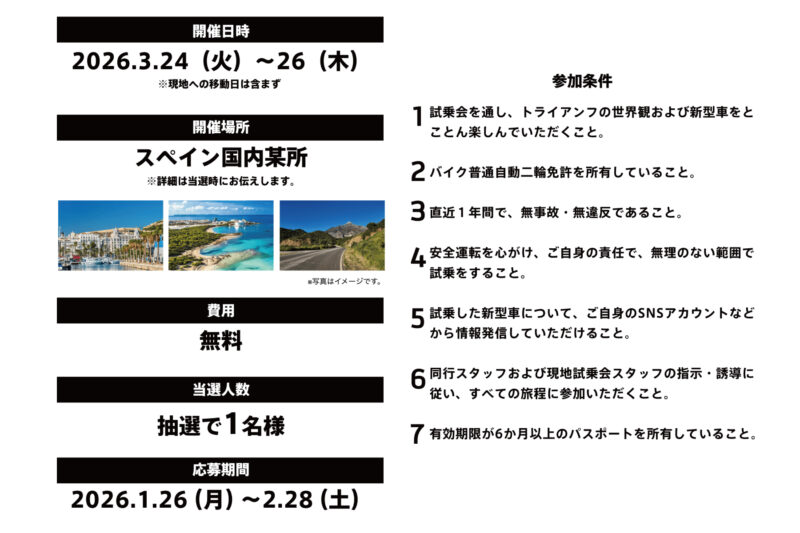 - 今春、スペインで開催されるトライアンフ海外試乗会 限定1名様募集!
