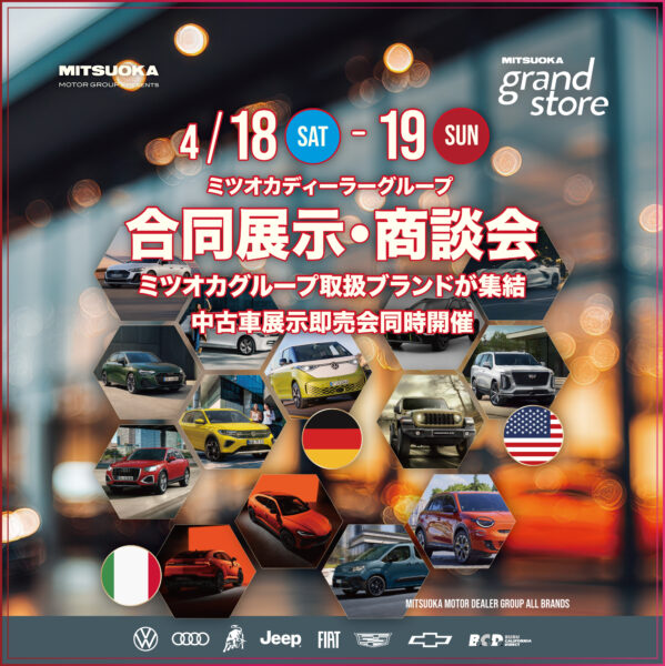- 4/18(土)・4/19(日)の2日間、ミツオカグランドストアにてミツオカディーラーグループ合同展示・商談会を開催いたします。
